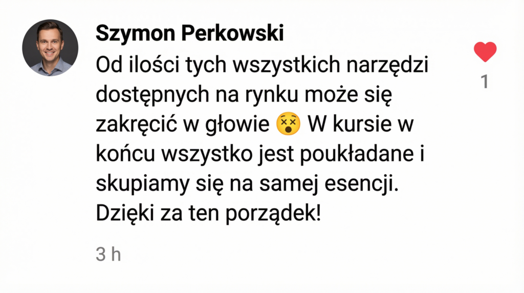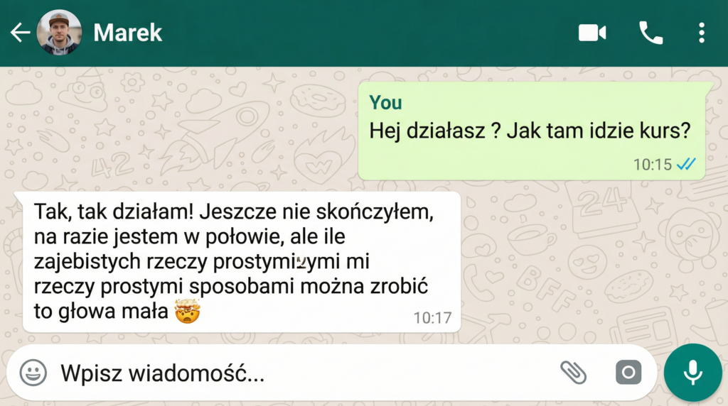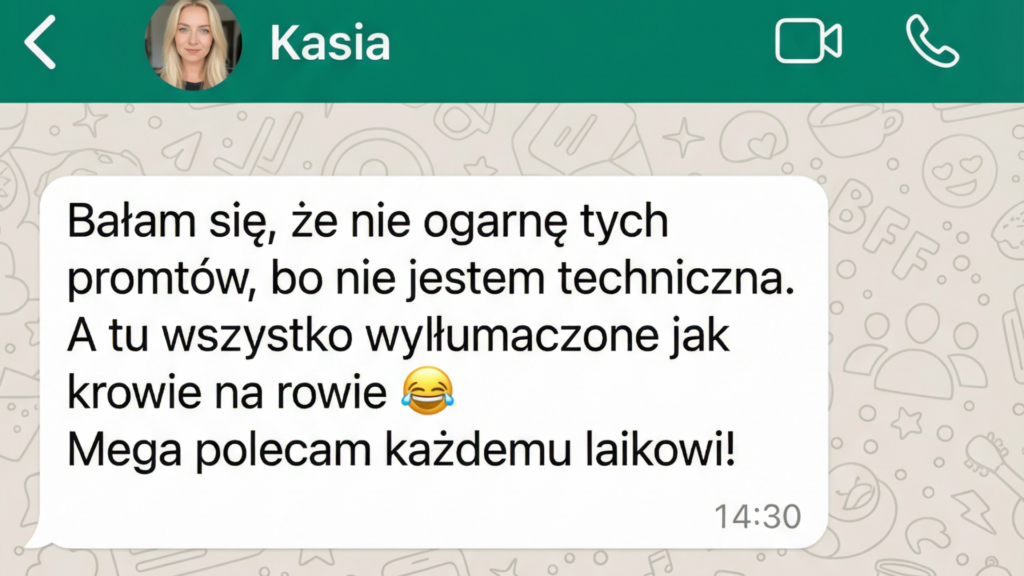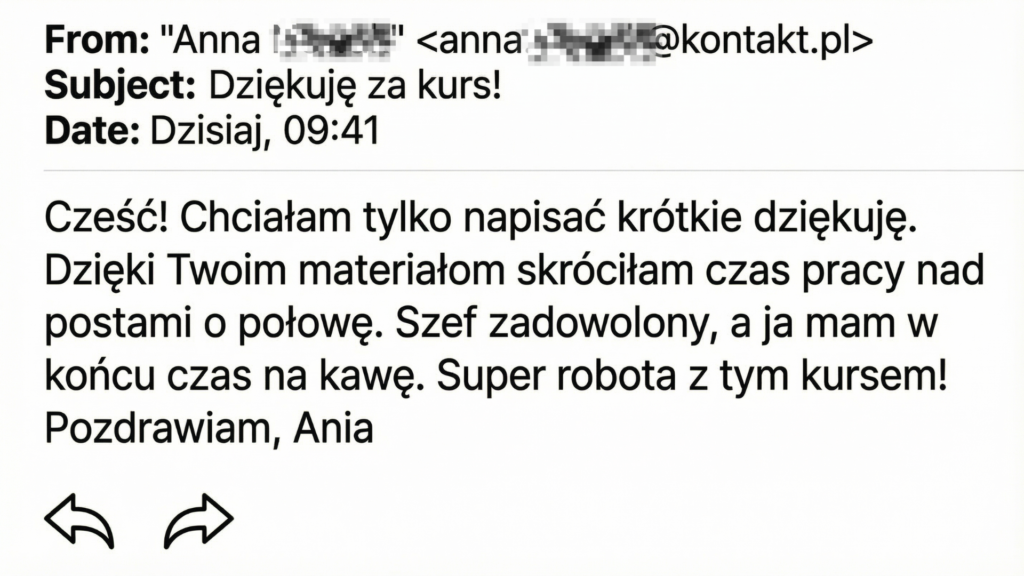 Jeden warsztat stacjonarny o AI kosztuje 500-1500 zł i trwa 4 godziny. Tutaj dostajesz kompletny system wideo, gotowce do wklejenia . Możesz wracać do lekcji ile razy chcesz. Bez limitu czasu. Ten kurs oszczędza Ci miesiące nauki i przynajmniej kilkaset złotych na testowanie narzędzi.